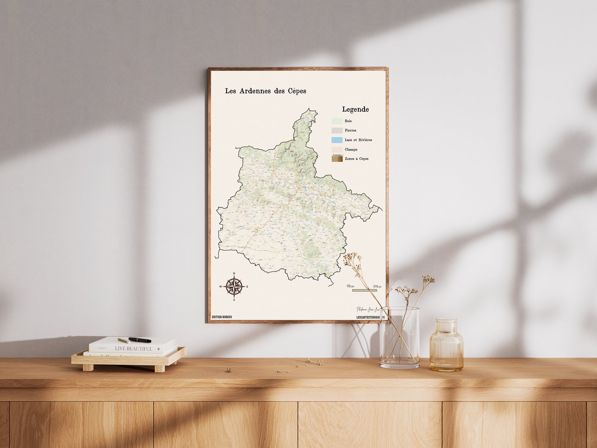 À accrocher dans votre salon, votre cuisine ou au-dessus de la cheminée, cette carte des coins à Cèpes des Ardennes apportera une touche authentique à votre intérieur tout en vous révélant les zones les plus propices à la pousse des Cèpes.