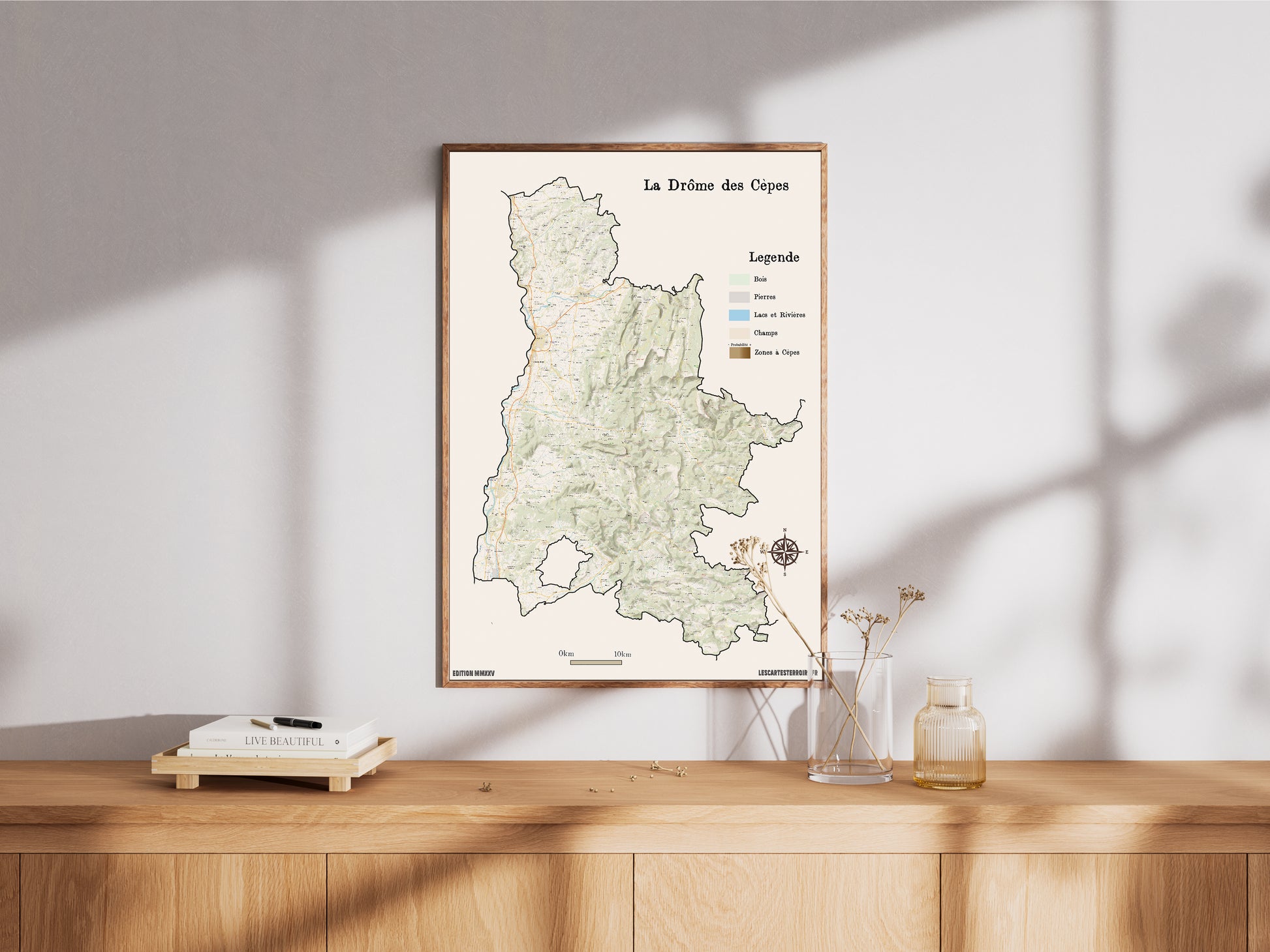 Des forêts fraîches du Vercors aux boisements clairs des Baronnies, cette carte met en lumière les zones les plus favorables à la pousse des Cèpes dans le 26, tout en apportant une touche naturelle et authentique à votre décoration.