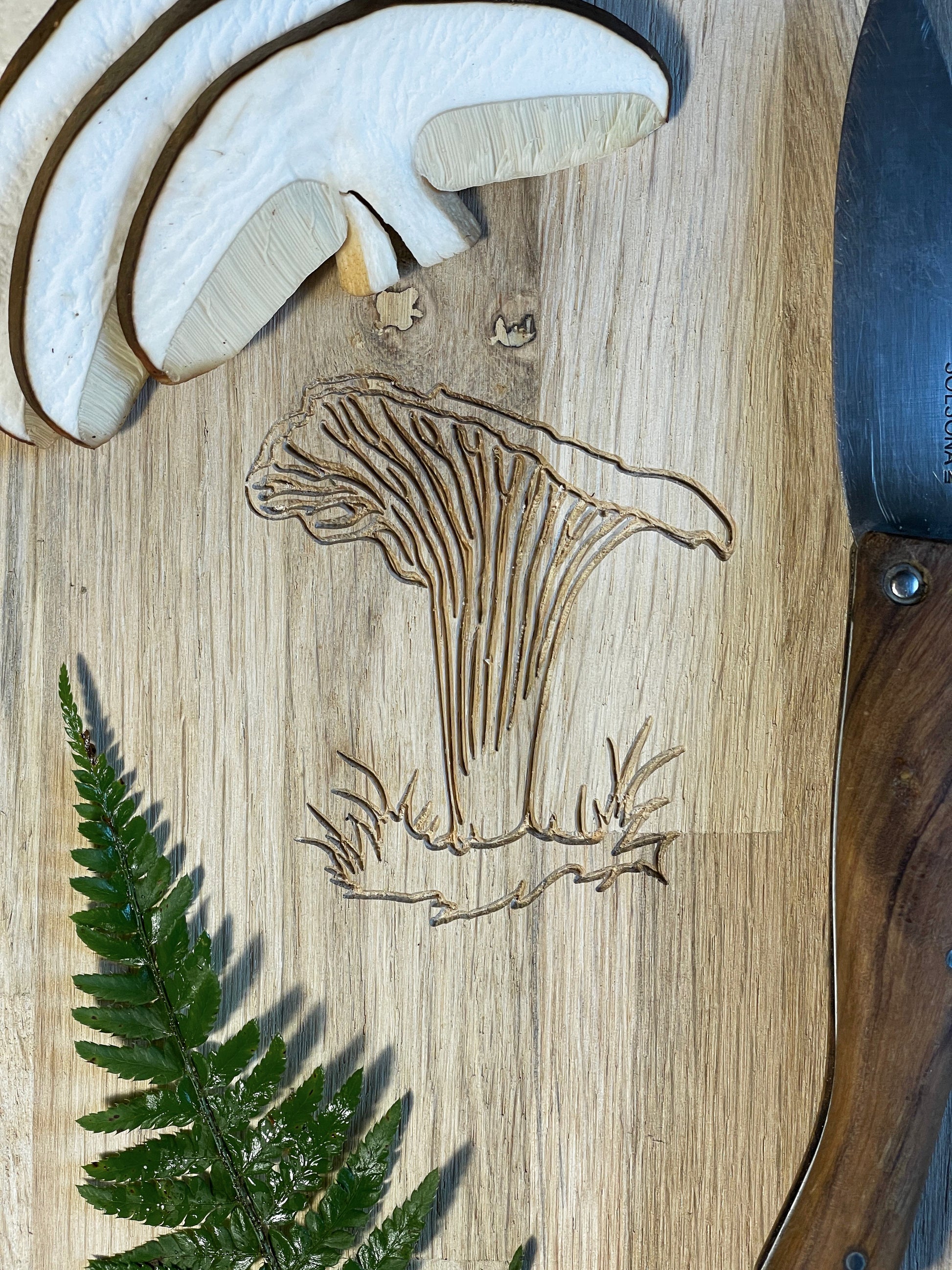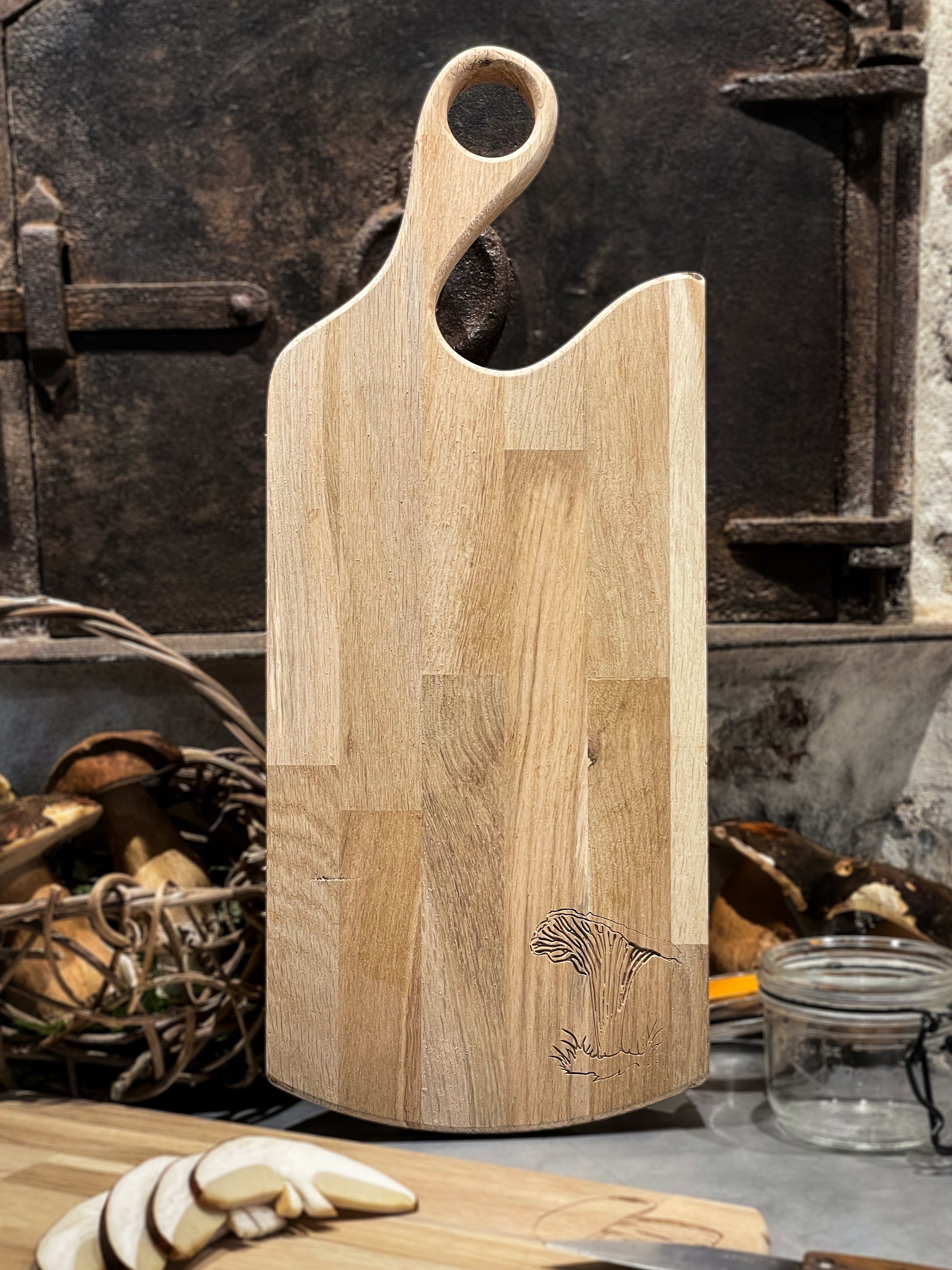 Planche à découper en chêne massif – Gravure Girolle (45x18 cm)